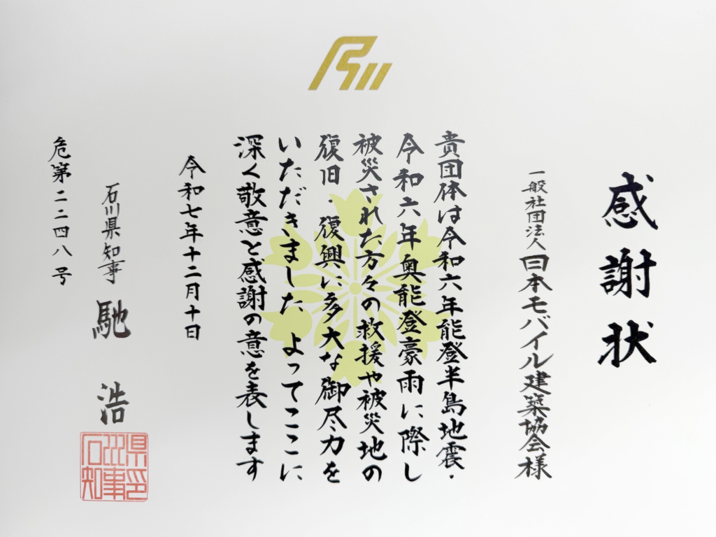 当協会は、『石川県主催の令和6年能登半島地震・令和6年奥能登豪雨 知事感謝状贈呈式』において、石川県知事から感謝状を授与されました。
